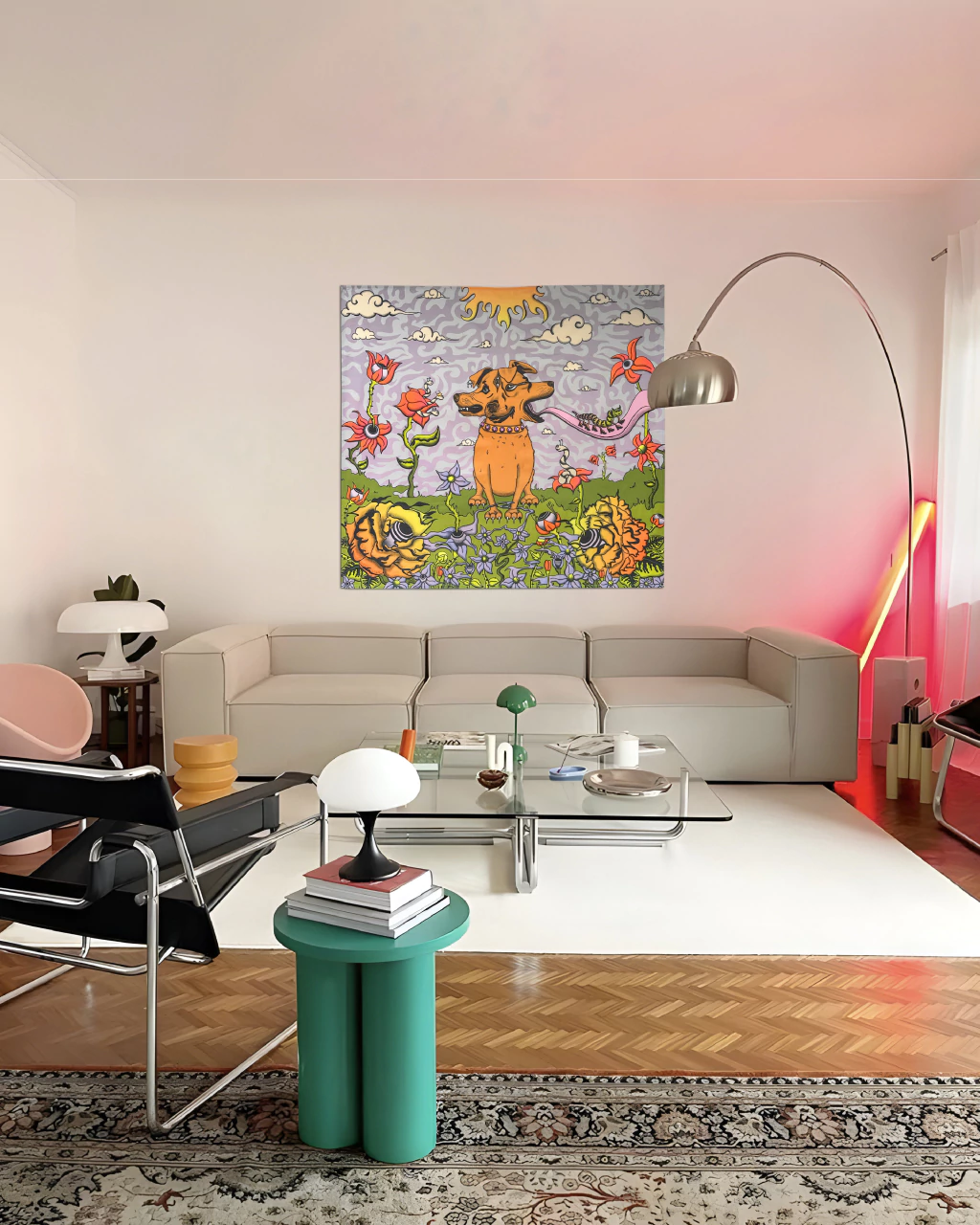 Hay universos que no se inventan: nacen del amor. Tiny’s World es un tapiz inspirado en Tiny Tina, una paticorti muy especial para mí. Cada una de sus cabezas refleja una de sus tantas expresiones, rodeada de un jardín surreal: flores con corazones de sus mini pelotitas de tenis favoritas y criaturas misteriosas que completan su mundo.