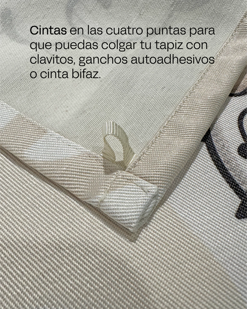 El tapiz tiene una cinta para que lo puedas colgar de la pared, pero si preferís usarlo como cubre o pie de cama, para cubrir el sillón o como manta de playa o pic-nic, también podés.
